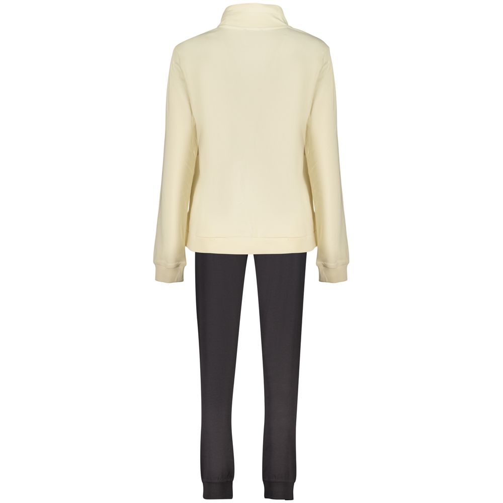 SWEATSHIRT AND TROUSERS SET, BEIGE LONG-SLEEVED SWEATSHIRT, 2 POCKETS, ZIP, BLACK SPORTS TROUSERS, ELASTIC WAIST WITH LACES, ANKLE CUFF, RHINESTONE APPLICATION, PRINT, LOGO