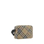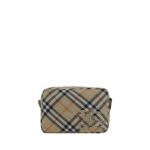 Shoulder Bag by Burberry, adjustable and removable shoulder strap, zippered top closure, iconic all-over repeated Check pattern, embroidered brand logo patch on front, single interior compartment.
