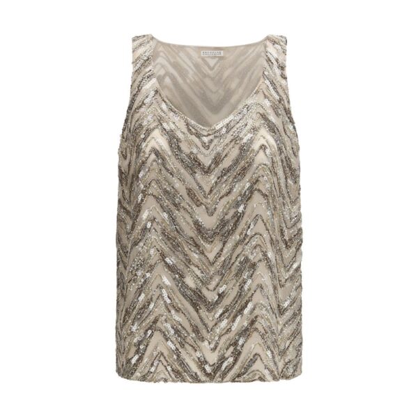 Final Cost: After CouponThe embroidered Top by Brunello Cucinelli delivers refined, luminous elegance. Crafted from Crispy silk, it is enhanced by a distinctive Dazzling Chevron Embroidery, a special craftsmanship detail that adds depth and radiance to the design. The V-neckline highlights the silhouette with femininity, while the intricate workmanship reflects the brand’s artisanal excellence and sophisticated aesthetic.