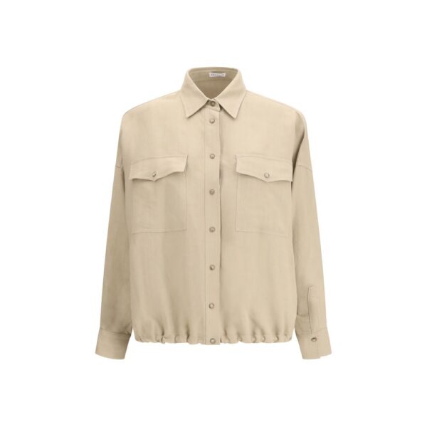The viscose and linen Fluid twill Shirt by Brunello Cucinelli combines elegance and comfort with a sophisticated design. Featuring a placket closure with snap buttons, a classic collar, and dropped shoulders, it offers a relaxed fit. The snap button cuffs, two patch pockets with flaps and buttons on the chest, and drawstring hem add practicality and style. A versatile and modern garment, perfect for any occasion.