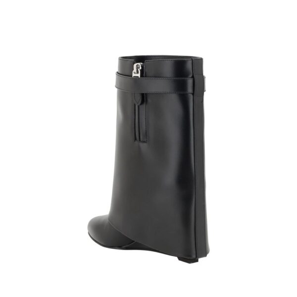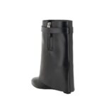 Givenchy’s Shark Lock leather Ankle Boots stand out for their bold and sophisticated design. Featuring an almond toe and a distinctive trouser-style shaft, they combine structured elegance with a contemporary spirit. The padlock detail on the side panel adds an iconic and distinctive touch, while the wedge heel ensures momentum and stability.