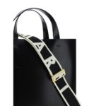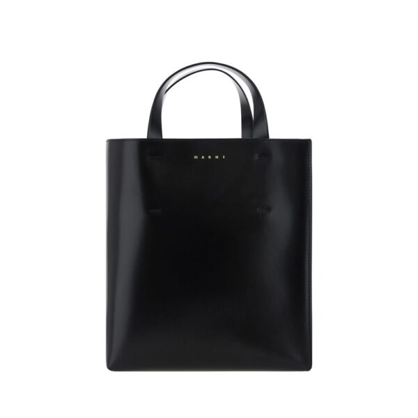 Calfskin Museo Handbag by Marni, iconic brand monogram printed in contrast on front, two flat handles for carrying it by hand, removable and adjustable flat monogrammed shoulder strap, single interior compartment, interior slit pocket, cotton lining.