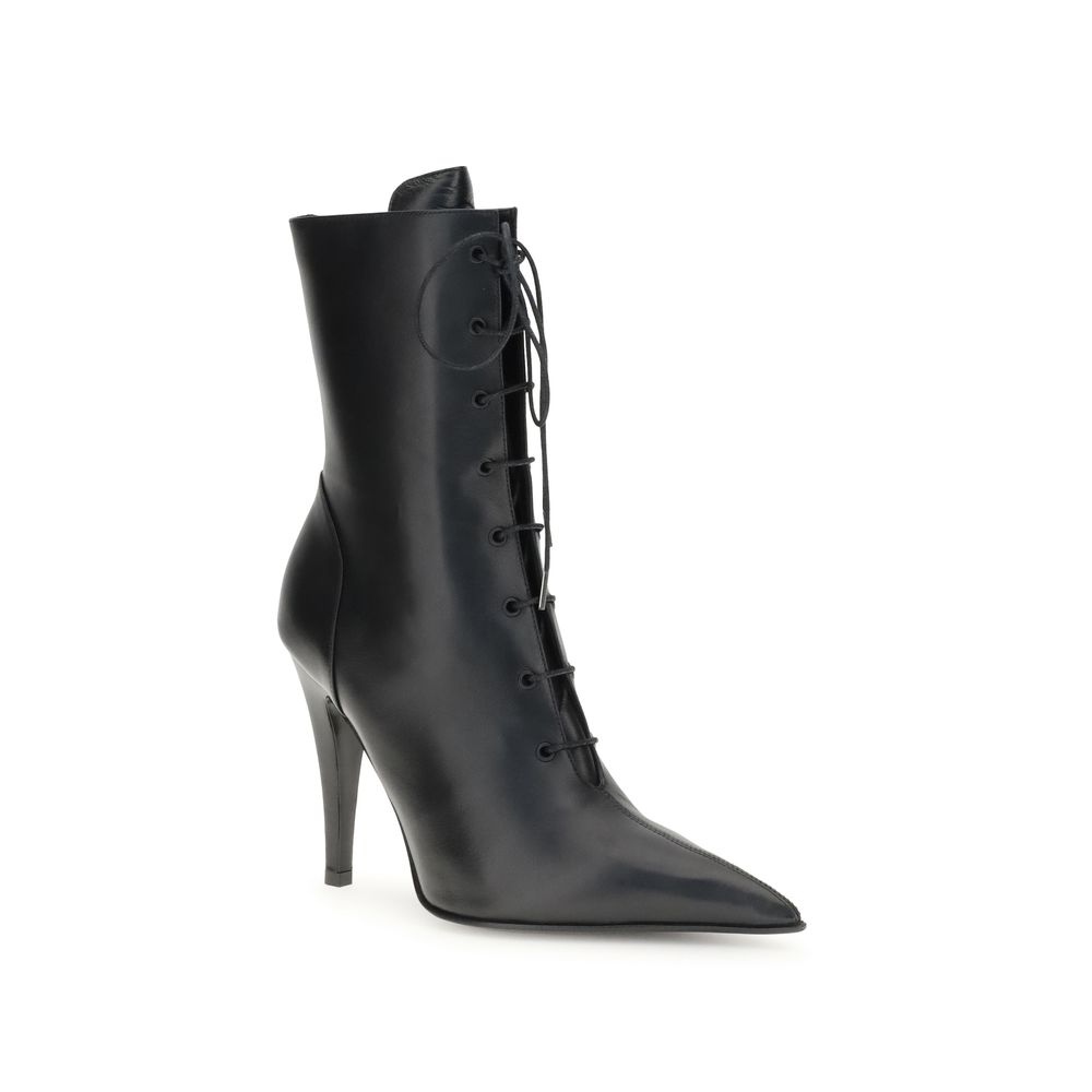 TheLeather Ankle Boots by McQueen combine boldness and refinement. The pointed toe elongates the silhouette, while the braided laces at the front add a distinctive artisanal detail. The side zip ensures easy wear, and the high heel provides elegance and femininity, making this model perfect for sophisticated, contemporary looks. The quality leather and meticulous finishing complete an iconic design, characteristic of McQueen’s style.