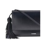 Jil Sander’s Tassel Shoulder Bag, made of leather, features side tassels and the brand’s embossed logo. It has two interior compartments, one zippered, and closes with a practical magnetic button closure. Soft side gussets complete the design, combining functionality and minimalist style.