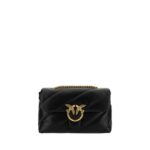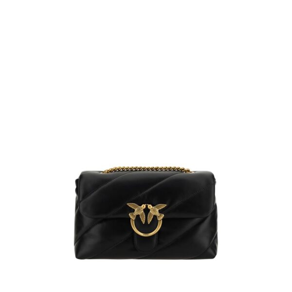 Calfskin Love Classic Shoulder Bag by Pinko, front closure with magnetic button, iconic gold-plated Love Birds logo embossed on the front, quilted and padded design, double internal compartment, sliding chain shoulder strap, iconic brand monogram embroidered tone-on-tone on the back.