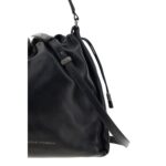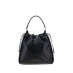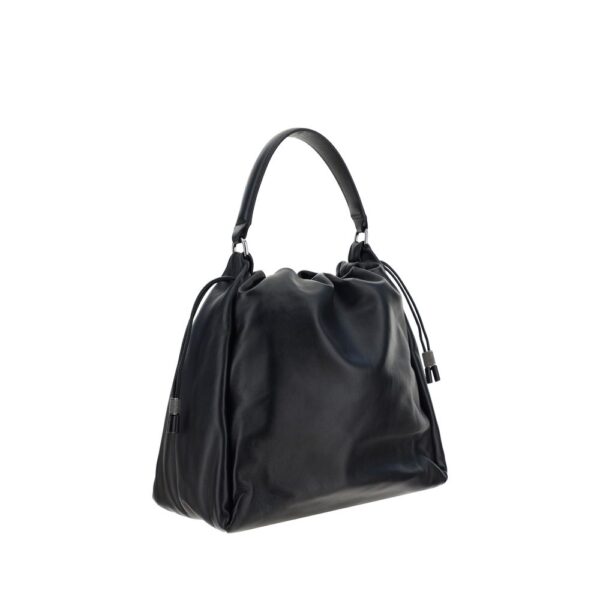 Leather Shoulder Bag by Brunello Cucinelli, top closure by drawstring, adjustable and removable flat handle at top, one compartment, iconic brand signature press-stamped on front.