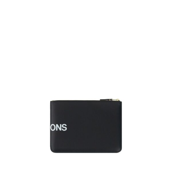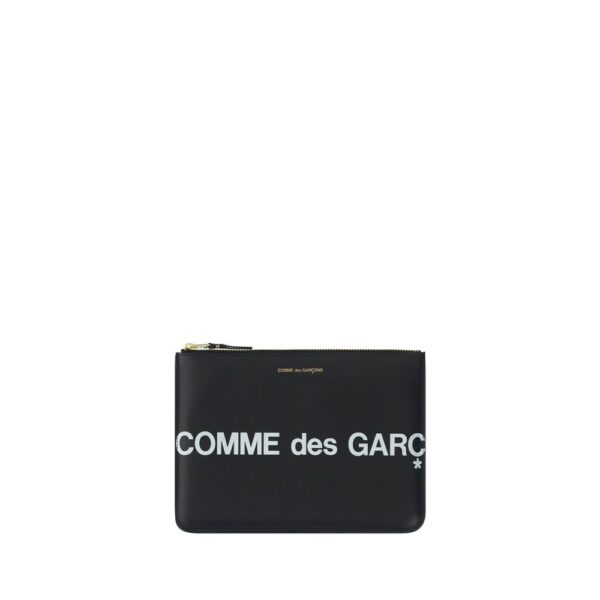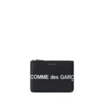 Calfskin Coin Purse by Comme des Garçons, contrasting printed logo on front and back, top zipper closure, single internal compartment, brand signature printed press-stamped on front.