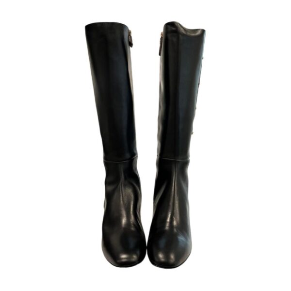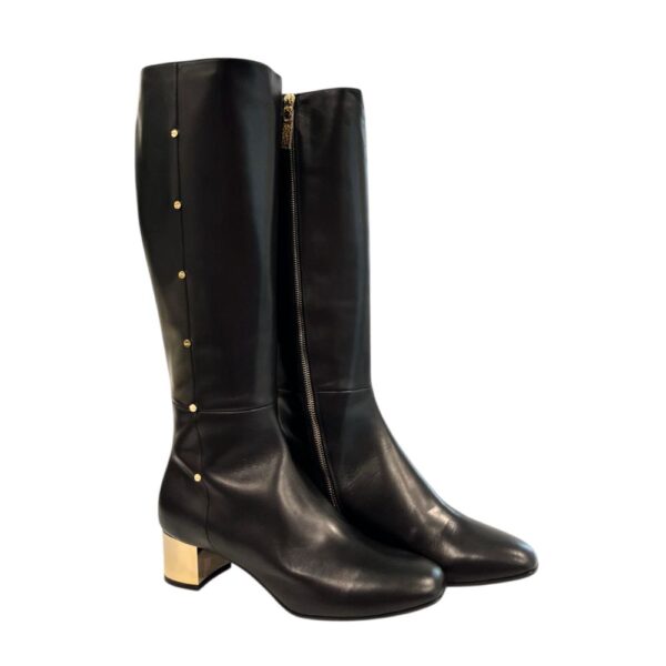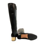 Unleash your inner trendsetter with Borbonese’s exquisite long boots, crafted to perfection in opulent genuine leather. Made in Italy, these boots are the epitome of chic with their timeless black hue and a comfortable low heel for all-day wearability. The gleaming gold metallic accents provide just the right amount of sparkle, making them a dazzling addition to your footwear collection. Elevate your style with the effortless elegance of Borbonese.