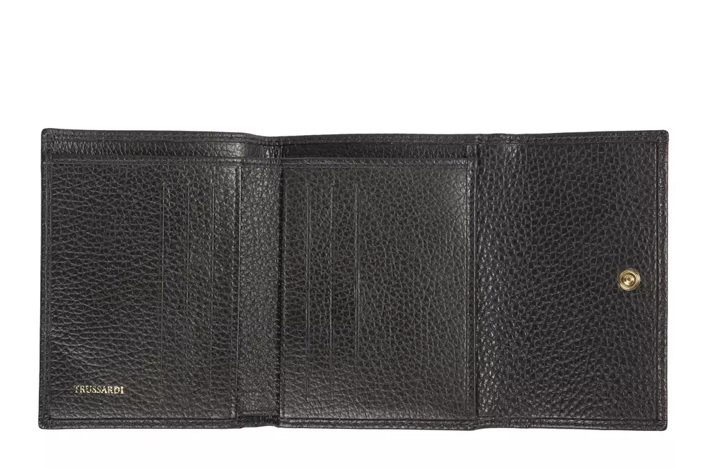 Elevate your everyday essentials with the Trussardi Women’s Wallet, a symbol of sophistication and functionality. Expertly crafted in Italy from premium embossed leather, this sleek black wallet boasts a structured form with a secure press-button closure. It’s designed to hold all your monetary needs, including a dedicated space for banknotes and ample card holders to keep your critical cards within easy reach.