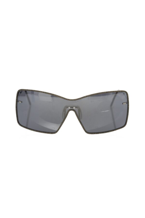 Elevate your style to iconic status with these Frankie Morello avant-garde shield sunglasses. Designed for the trendsetter, they boast a sleek thin metal profile, complemented by striking gray mirror lenses. This Italian creation merges edgy aesthetics with sublime craftsmanship, perfect for making a bold fashion statement.