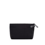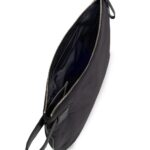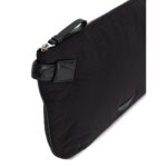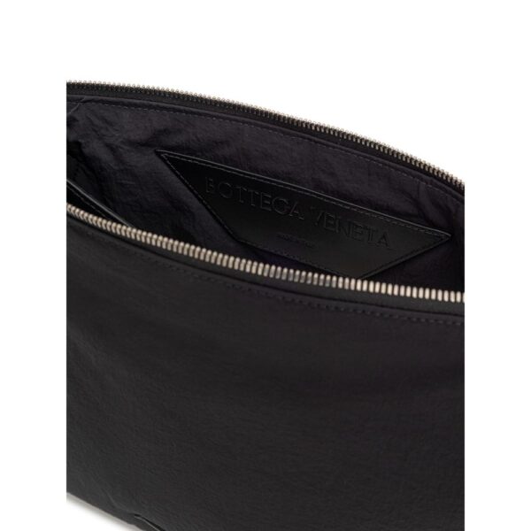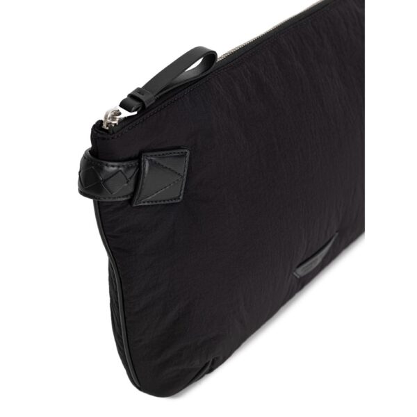 Bottega Veneta Black Nylon Light Paper Clutch. Padded nylon clutch bag, top zip opening and leather pull. Single compartment, inside pocket. Leather tag with tone-on-tone printed logo, removable leather handle with woven motif. Composition: Nylon, Leather