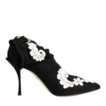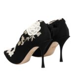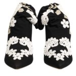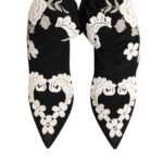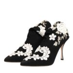 Gorgeous brand new with tags, 100% Authentic Dolce & Gabbana Women’s Stiletto Boots crafted from black stretch jersey with contrasting white and metallic floral embroidery. These elegant pointed-toe ankle boots feature a slim stiletto heel, combining modern style with timeless Dolce & Gabbana luxury.