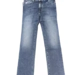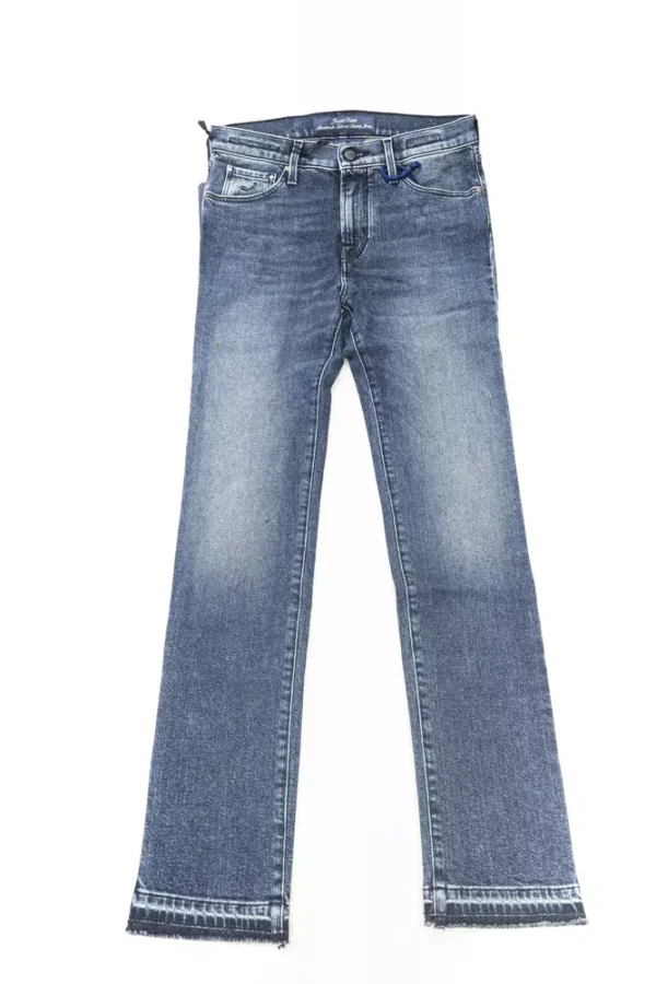 Indulge in the epitome of Italian craftsmanship with Jacob Cohen’s slim-fit jeans, tailored to perfection for a chic silhouette. These blue denims boast the brand’s iconic logo-embossed button and precisely embroidered pocket detail. The pony skin label radiates luxury, while playful fringes dance along the bottom, adding a trendy edge to a classic look. Crafted from a harmonious blend of cotton and elastane, these pants promise both comfort and enduring style.