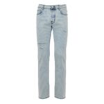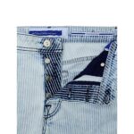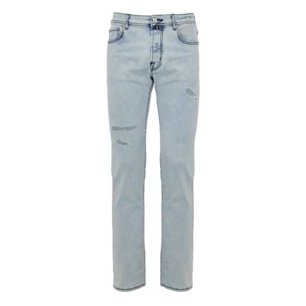 nIn cotone stretch azzurro a righe con piccoli strappi, cinque tasche, allacciatura con bottone metallico e bottoni coperti, regular slim fit, ricamo J sul taschino. Sul retro tag in cavallino bianco con logo applicato, impunture blu scure a contrasto. In vendita con bandana in cotone e profumati con esclusiva fragranza Jacob Cohen.