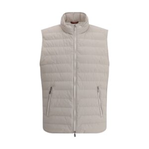 Brunello Cucinelli’s Down Vest is a stylish and functional garment featuring a high collar that offers added protection and warmth. The front zipper closure ensures practicality, while the two welt pockets with side zippers add functionality without compromising style. The monochrome pattern lends a clean, sophisticated look, while the quilted design and all-over padding ensure optimal comfort and warmth. A perfect garment to face the coldest days with elegance.
