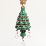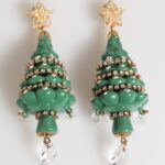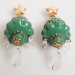 nThese festive statement earrings are crafted in gold-tone brass and decorated with vibrant green enamel, crystal embellishments, and sparkling star studs. Finished with dangling teardrop crystals for added