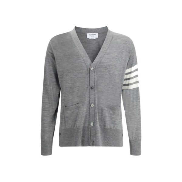 Fleece wool Cardigan by Thom Browne, striped cuffs with button, ribbed hem with adjustable side slits with buttons, V-neck, front button closure, two patch pockets on front, iconic brand logo bands on left arm, internal profiles with iconic brand colors.
