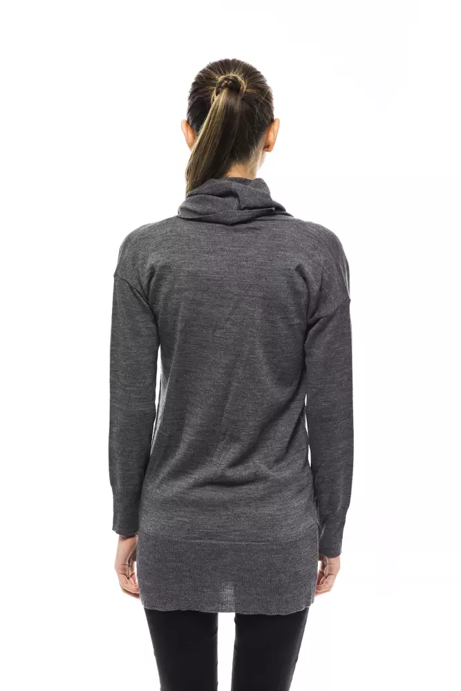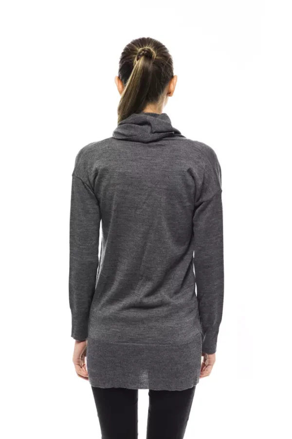 Unleash the epitome of chic with Montana Blu’s High Collar Max Pull Sweater. A fashion statement in itself, this piece is adorned with an embellished logo that serves as the hallmark of sophistication. Crafted with the finest wool and acetate blend, it promises warmth without compromising on style. Made in Italy, its high collar adds an extra touch of elegance, ensuring you stand out in the urban fashion jungle. The sleek gray tone allows for endless versatility in pairing.