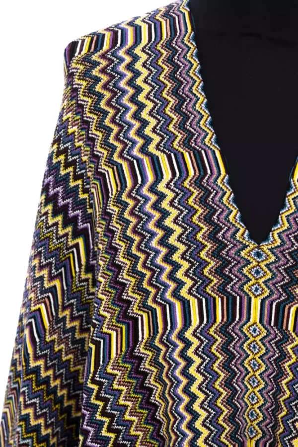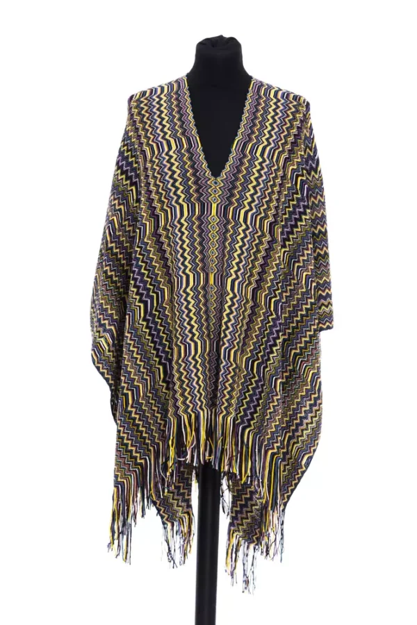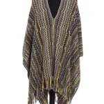 Wrap yourself in the artful elegance of Missoni’s fringed poncho. A standout piece that dances with vibrant hues and geometric allure, this poncho exudes the bold and trendy spirit Missoni is renowned for. Crafted in Italy, it blends luxurious wool with whimsical marabou accents, perfect for making a chic statement on cooler days. Measuring 100 cm by 45 cm, plus playful fringes, it’s the ultimate expression of fashion-forward sophistication.