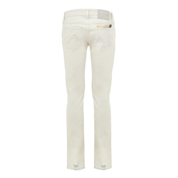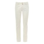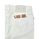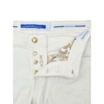 nIn white cotton with distressed details and small rips, five pockets, gold metal button closure and covered buttons, slim fit, and J embroidery on the pocket. A gray suede tag with embossed logo is featured on the back. Sold with a cotton bandana and scented with the exclusive Jacob Cohen fragrance.