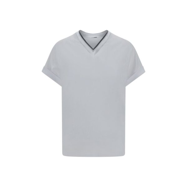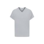 The cotton T-Shirt is a sophisticated and versatile piece by Brunello Cucinelli, featuring a V-neckline embellished with the iconic brilliant jewel detail, which adds a touch of luxury. The monochrome pattern gives an elegant and clean look, while the regular fit ensures comfort and practicality. Perfect for a casual yet refined look, this T-shirt is ideal for those looking for a high-quality piece with a distinctive touch.