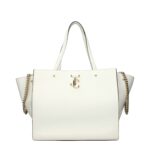 nThe product with MPN AVENUEDAWLATTELIGHT and code F85115 leather in white is a shoulder bags designed by Jimmy Choo. It has features like front logo, back logo, studs, removable details.