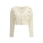 Alessandra Rich’s mohair Cardigan with embroidery combines romance and sophistication in a retro-inspired design. Featuring a V-neckline, it features a button closure, ribbed hem and cuffs. Delicate perforated details and floral embroidery on the front complete the garment with a feminine and sophisticated touch.